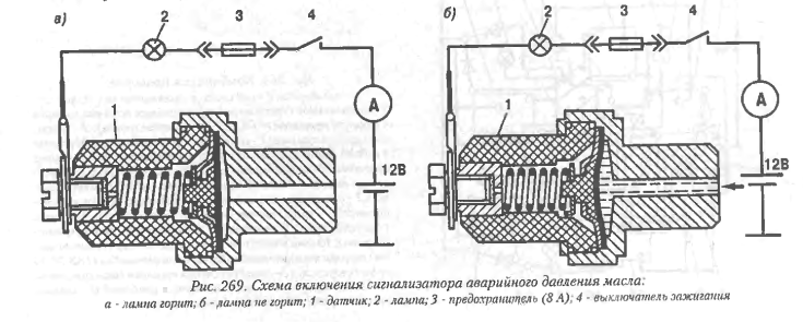 Вот схема включения сигнализатора аварийного давления масла .