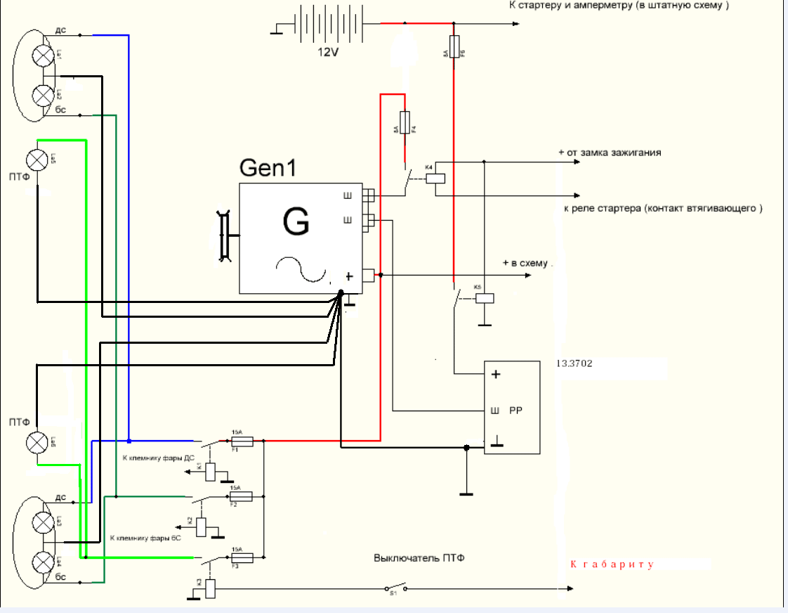 Это тот плюс, который в штатной схеме шёл на вывод "+" РР от замка зажигания , просто снял с РРа , и на доп . реле (№5) надел . Потому, что я все реле ставил на правом(глядя по ходу машины) крыле - РР и генератор находятся рядом. И тут-же крепил разгрузочные реле фар . Всё рядом .