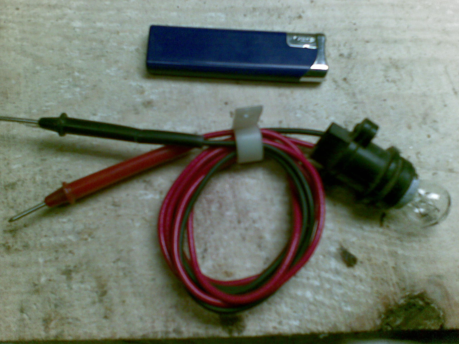 Самый простой вариант: «Контролька» Самая обычная лампочка на 12В с припаянными к ней проводами. Прижав один кончик к кузову а второй к нужному месту, можно узнать есть ли ток на этом контакте, а по яркости свечения- насколько он сильный. Легко и непринуждённо можно сделать самому, а можно купить в магазине всевозможные вариации на тему со светодиодной подсветкой, и прочими свистелками и перделками. Рекомендуется для хранения в бардачке.