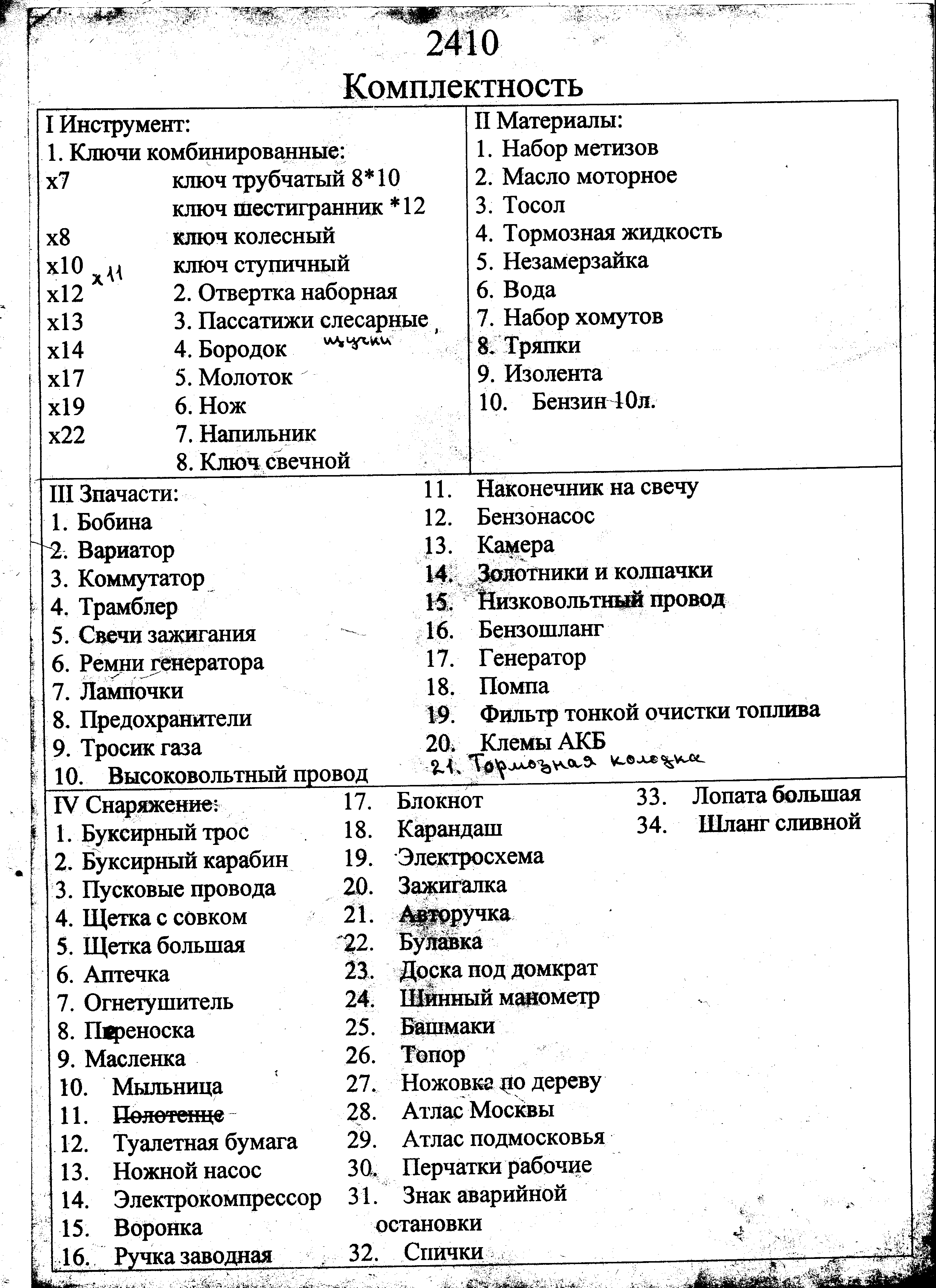 Из запчастей: лампочки, бензиновые шланги и фильтры, хомуты, свечи, щётки генератора, камера, всякие ремкомплекты, планка натяжения ремня генератора, колёсные гайки, что-то ещё, уже не помню.