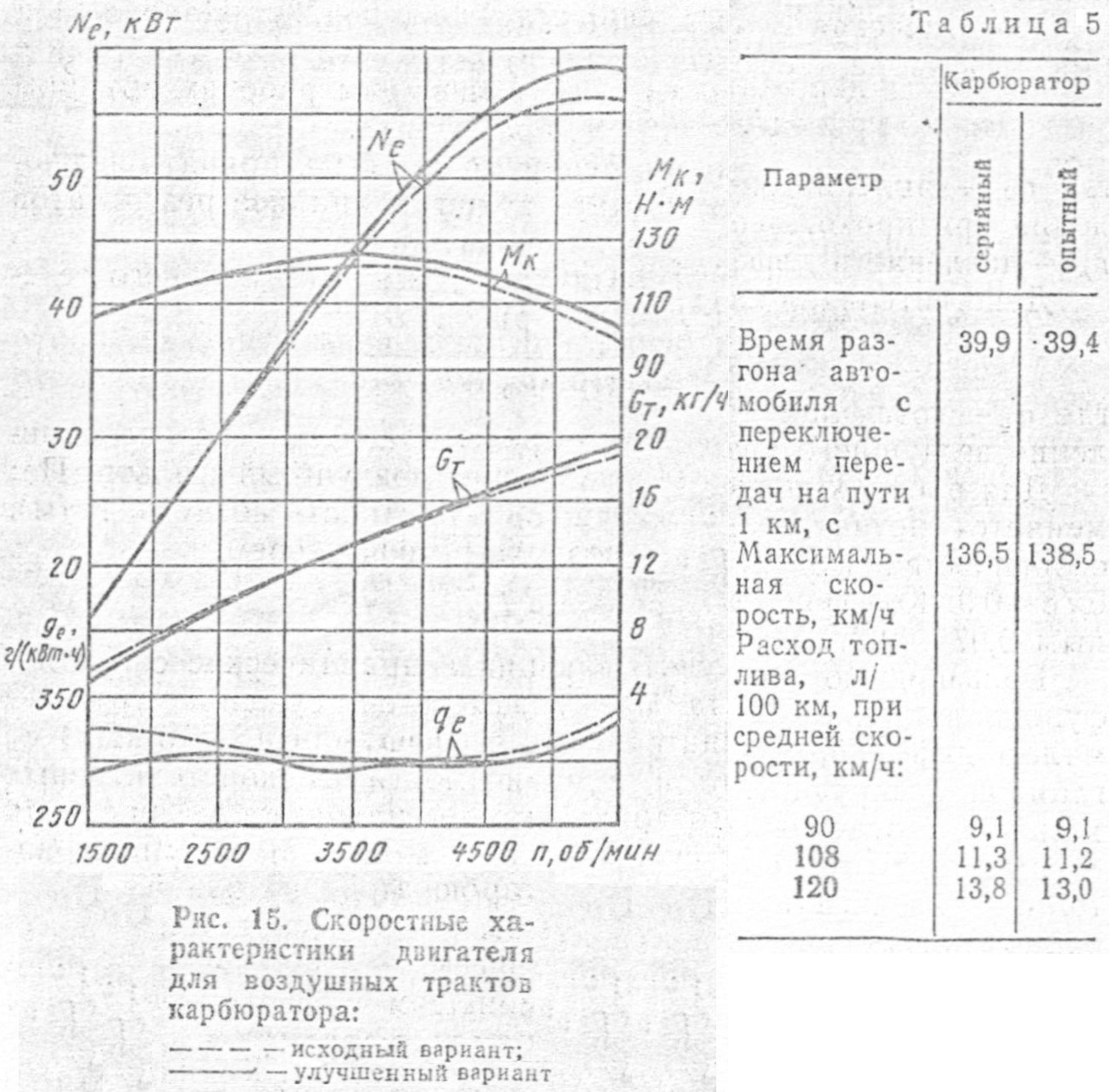 В конце 80-х в НАМИ велись эксперименты с увеличением суммарной площади диф-ов, путем расширения Ø БД на основе прибора ДААЗ 2107 ОЗОН. Апробация производилась на полноприводном с двигателем ВАЗ2106 1,6л. Привожу результаты из публикации АВ Дмитриевского и ВФ Каменева. Вариант, что меня заинтересовал в Таблице2 обведен красным. Он имеет оптимальное соотношение Sк/Sд и легко может быть реализован на К126Г. Из графика хорошо видно как подросла мощность при работе только первой камеры, а в Таблице3 интересен прирост скорости при тех же условиях.