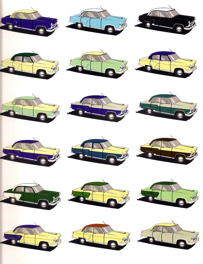 Вполне достойно выглядит комбинация более светлого кузова с темной крышей. К примеру когда-то по минску ездила коричневая волга с черной крышей - по-моему мнению сочетание весьма приличное, не веет 50-ми...24-ке это ни к чему. Или к примеру игра с оттенками одного цвета - темнокоричневый-светлокор, темн. зел. - светл. зел. Но! Если только крыша. По линии выштамповки я бы не красил.