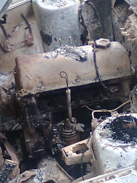 А я так и не смог определить марку. Один бампер оторван, валяется в стороне, другой просто расплавился и стёк чёрной лужей, заднее секло упало внутрь, размягчилось и облегло неровности - в общем, всё выгорело дотла.