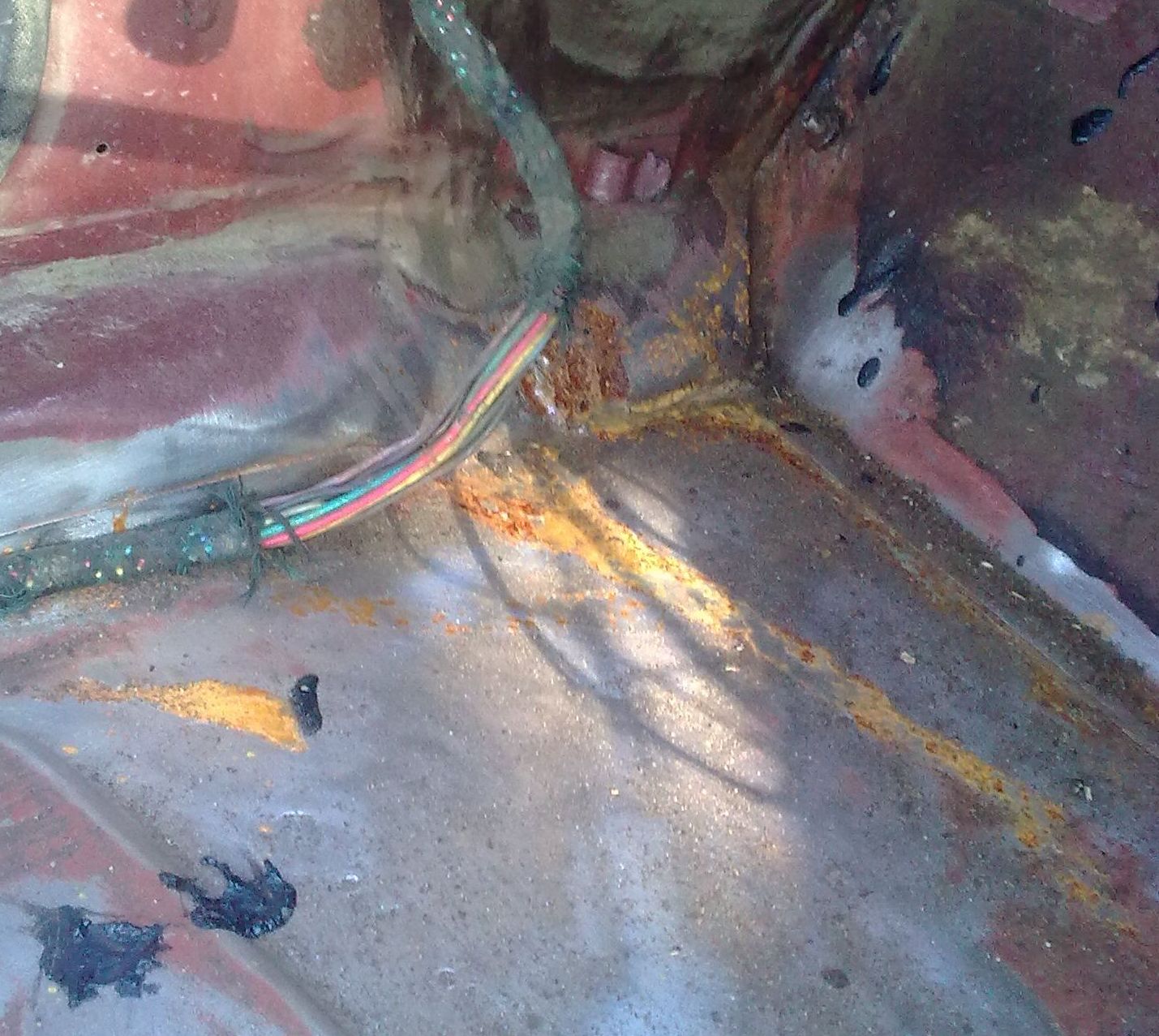 Покатался несколько дней, разбирать начал с салона. Сохранность пола на 5 с маленьким минусом, в районе где пол переходит в моторный щит около порога, в самом углу, немного ржавчины. Начал ковырять заводское покрытие хрен отдерешь решил его оставить, где отодралась есть немного коррозии зачистил надо грунтовать. Еще разобрал морду в принципе ничего крименального, но в местах где крепеж, и в местах соединения панелей ржавчина. Сейчас жду денег для начала работ по жестянке и покраски.