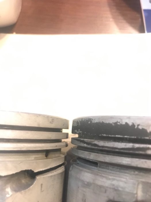 Разобрал мотор, для кап. ремонта. Буду менять гильзы с поршнями. У нас в Литве нашёл 4 поршня такие как те что стаяли. Но два с сквозными отверстиями с низу в том месте где палец встовляится и два в том месте только надсверлены. Разница в весе от тяжолого до лёгкого, 4 грамма. И нашол 4 одинаковых поршня (разница в весе 3 грама от лёгкого до тяжолого), но они отличаются по коду (последние две цифры 15, на Волговских по каталогу 14) и сами поршня отличаются по бокам они с проризю и ровные в том месте где отверстие под палец. И кольца на разной высоте устонавливаются, хотя сами поршни по высоте одинакавые (видно на фото). Разница самих поршней в 40 грам. Старый поршень весит 576гр. новый 533гр. На первом фото тот поршень что выташил с мотора. На втором те поршни что нашол.