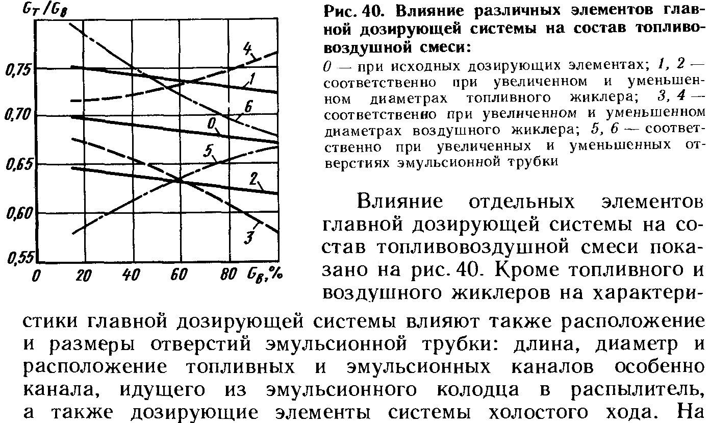 АВ Дмитриевский в своей книге "Карбюраторы:...." 1995г. на стр.100 приводит график влияния элементов ГДС на состав ТВС. Из графика видно, что уменьшение диаметра ГВЖ приводит к обогащению ТВС. Если при частоте вращения 5000 наблюдается дымление, - значит при разряжении 7106Па в МД и ГВЖ -1,11(230) смесь обогащена - нет достаточной компенсации смеси в эмульсионном колодце, в виду упрощенной(грузовой) конструкции данного узла.(эмульсионная трубка не имеет обтюрирующего пояска, т.е. нет кольцевой щели снижающей разряжение у ГТЖ, а есть заметный кольцевой зазор, через который топливо беспрепятственно поступает в верхнюю часть эмульсионного колодца, при этом эффект пневмоторможения снижается или исчезает совсем). Для устранения дымления можно попытаться увеличить ГВЖ до 270, используя ГВЖ от УАЗовского К129Ж или возможно даже до 280, используя ГВЖ от ЗАЗовского К133. Думаю такая замена обеднит смесь в диапазоне 4500-5000об/мин.