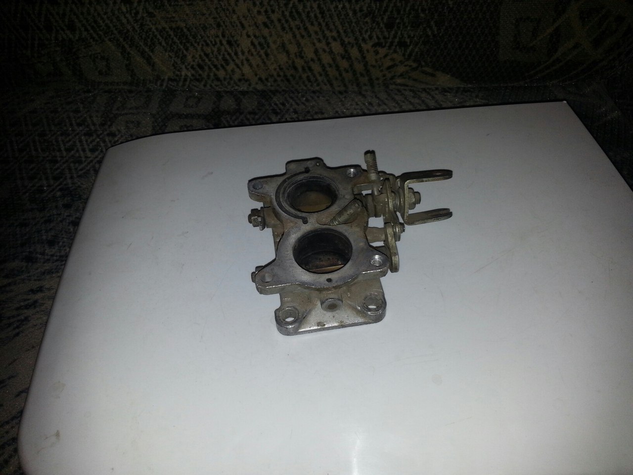Достался мне карб - сборная солянка. Середина от 135-го, верхней части нет вообще, а вот подошва... А вот подошва такая: на вид похожа на москвичевскую от К-126Н, те же камеры 28+32, только вот винт регулировочный не сбоку от первой камеры, а ровно посередине между камерами. Вопрос знатокам: от какого карба может быть эта подошва? Быть может, какая-то модификация 126-го?