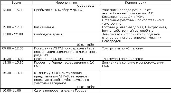 Для участников праздничного парада будут организованы: охраняемая парковка, встреча с руководством Горьковского автозавода и ветеранами, посещение главного конвейера и праздничный фуршет.