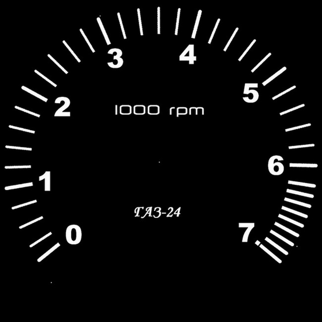 Взял готовую шкалу от фолькса (Нашел в инете). Отредактировал ее слегка в пеинте :mad: , уменьшил размеры, дописал снизу ГАЗ-24 :peace: и распечатал несколько экземпляров с разными размерами, подобрал наиболее подходящий. Т.к. 6-й тахометр до 8000 об. пришлось откалибровать прибор следующим образом - до разборки подключил прибор, выставил регулятором холостого хода 1000 об на прогретом двигателе, потом после установки новой шкалы потенциометром прибора добился показаний 1000 об. Пока еще работает :good: