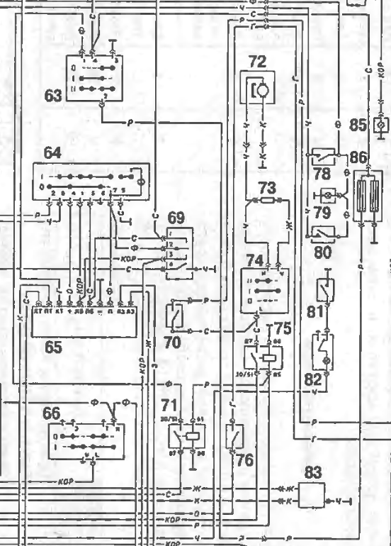 Участок схемы с обогревом : 63 - переключатель обогрева; 86 - обогрев; 71 - реле включения обогрева .