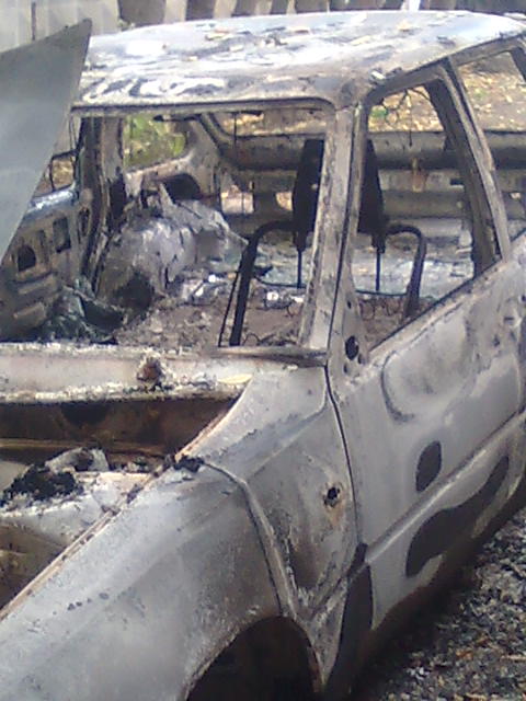 А я так и не смог определить марку. Один бампер оторван, валяется в стороне, другой просто расплавился и стёк чёрной лужей, заднее секло упало внутрь, размягчилось и облегло неровности - в общем, всё выгорело дотла.