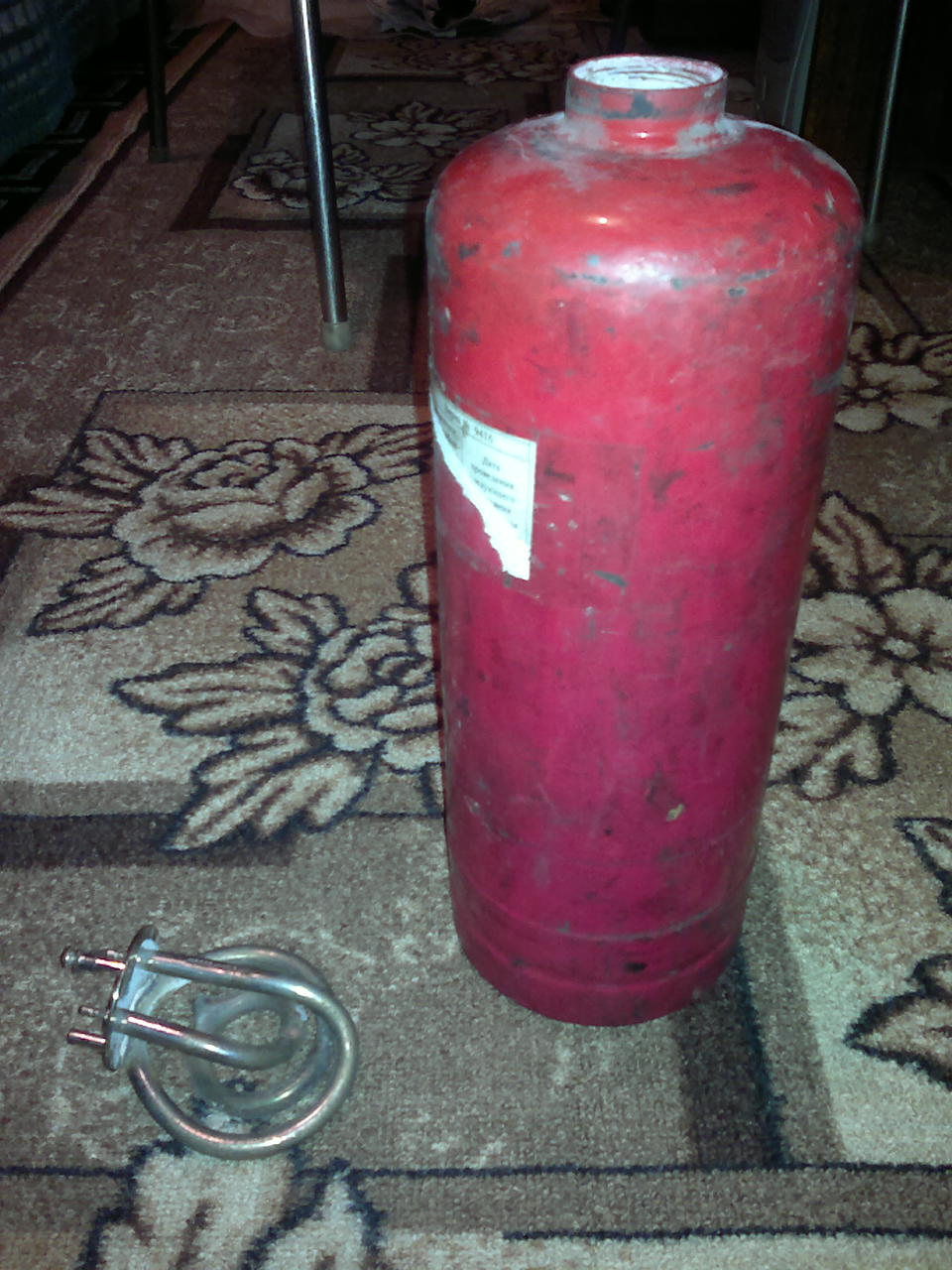 в сибири зимой бывает очень холодно а на работу ездить надо машина стоит на улице под окном мучать двигатель как то не хочется да и топливо жечь на прогрев до работы и с работы как то не хочеться. Посмотрев в магазине сей аппарат и цену на него 2600 тоже подумал что проще сделать самому вот и решил попробовать. Корпус решил сделать со старого огнетушитель отвернув от него трубку подачи с клапаном и вытрес с него весь порошок , купил тен от чайника и начал это совмещать.