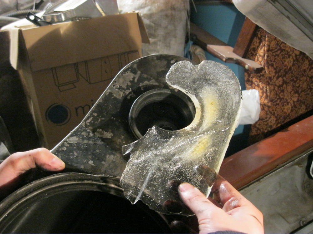 Крышка фильтра лежала кверху дном (я ее снял и отложил, после чего надолго ушел, а гараж течет), и в нее натекла вода и замерзла. Пришлось вытаскивать сие чудо:
