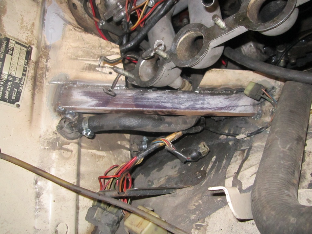 Все так и есть, просто на фотке не видно, к крайней шпильке коллектора со стороны салона прикручены три клеммы (наверное штук пять черных проводов), на крайней шпильке спереди прикручена одна клемма (провод сечением побольше, голубого цвета). Дополнительно на корпус ЭБУ подключал провод массы. Медная косичка от кожуха сцепления на кузов установлена.