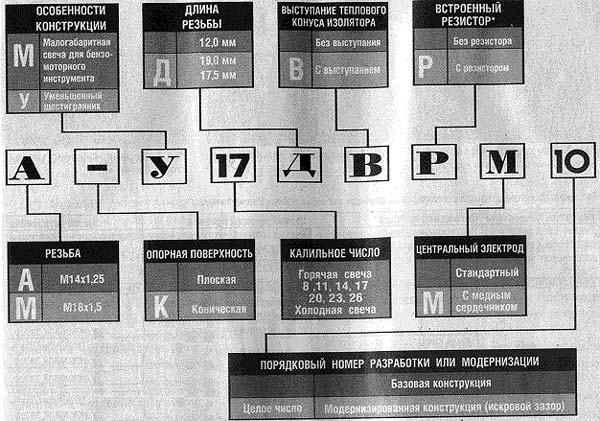 Чтобы охватить весь спектр бензиновых двигателей, различные параметры свечи отражаются в ее условном обозначении.