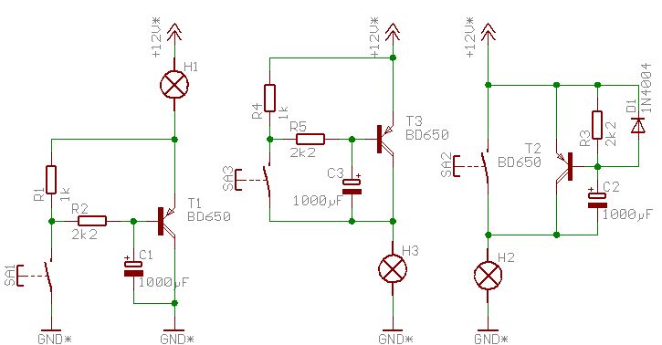 При открытии двери водителя «+» питания подаётся на обе указанных части схемы. Конденсаторы С1000 (число соответствует ёмкости конденсатора в мкФ, конденсаторы электролитические, на максимальное напряжение 35 В) заряжаются через буферные сопротивления R5 (цифра соответствует номиналу резистора в омах), оба транзистора отпираются, срабатывает реле Р1(например «TTI» TR81), контактная группа которого включена параллельно концевику двери. Теперь после закрытия двери, свет не погаснет, пока включено реле Р1, а как было указано выше, время его включённого состояния определяется балансировкой сопротивления R500K и может быть установлено при настройке схемы. Когда дверь водителя закрылась, конденсатор С1000 цепи базы транзистора КТ961А начинает разряжаться через p-n-переход база-эмиттер транзистора, на что у него уходит порядка 10…15 секунд. После разряда конденсатора транзистор закрывается и реле Р1 выключается. Тут в дело вступает вторая часть схемы, обеспечивающая плавное, комфортное для глаз, затухание салонного освещения. Принцип работы этой части схемы полностью подобен ранее описанному. Мы не применили полностью транзисторное управление освещением, дабы не терять часть накала лампы вследствие рассеивания мощности на сопротивлении транзисторного p-n-перехода. Контакты реле в данном случае куда предпочтительнее. Таким образом, после отключения реле Р1, транзистор КТ863А остаётся открытым, пока конденсатор в его цепи базы не разрядится через его переходы подобно предыдущему случаю. По мере разряда конденсатора сопротивление p-n-перехода КТ863А постепенно нарастает, что влечёт плавное затухание лампы салонного освещения в течение 3…4 секунд.